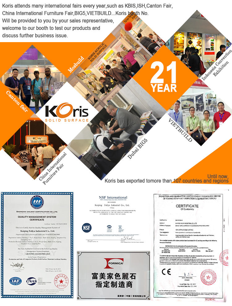 Koris solid surface sheets workshop area is 20000m2.We have production line production line for solid surface sheets prouction,20000pieces per month on average.